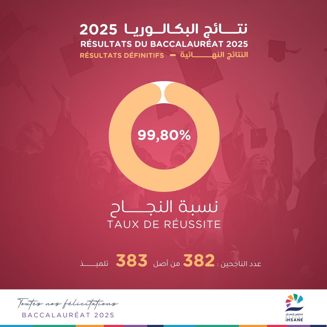 بفرح غامر وفخر كبير، تتوجه إدارة ثانوية إحسان إليكم بأحرّ التهاني بمناسبة نجاحكم المبهر في امتحان البكالوريا لهذه السنة! لقد رفعتم مجد مؤسستنا عالياً من جديد، فبعد صدور النتائج النهائية للدورة الاستدراكية بلغت نسبة النجاح الإجمالية 99.80% حيث بلغ عدد الناجحين 382 من أصل 383 تلميذاً، وهو إنجاز متميّز يعكس جدّيتكم وإصراركم والتزامكم الثابت طوال هذه السنة الحاسمة.