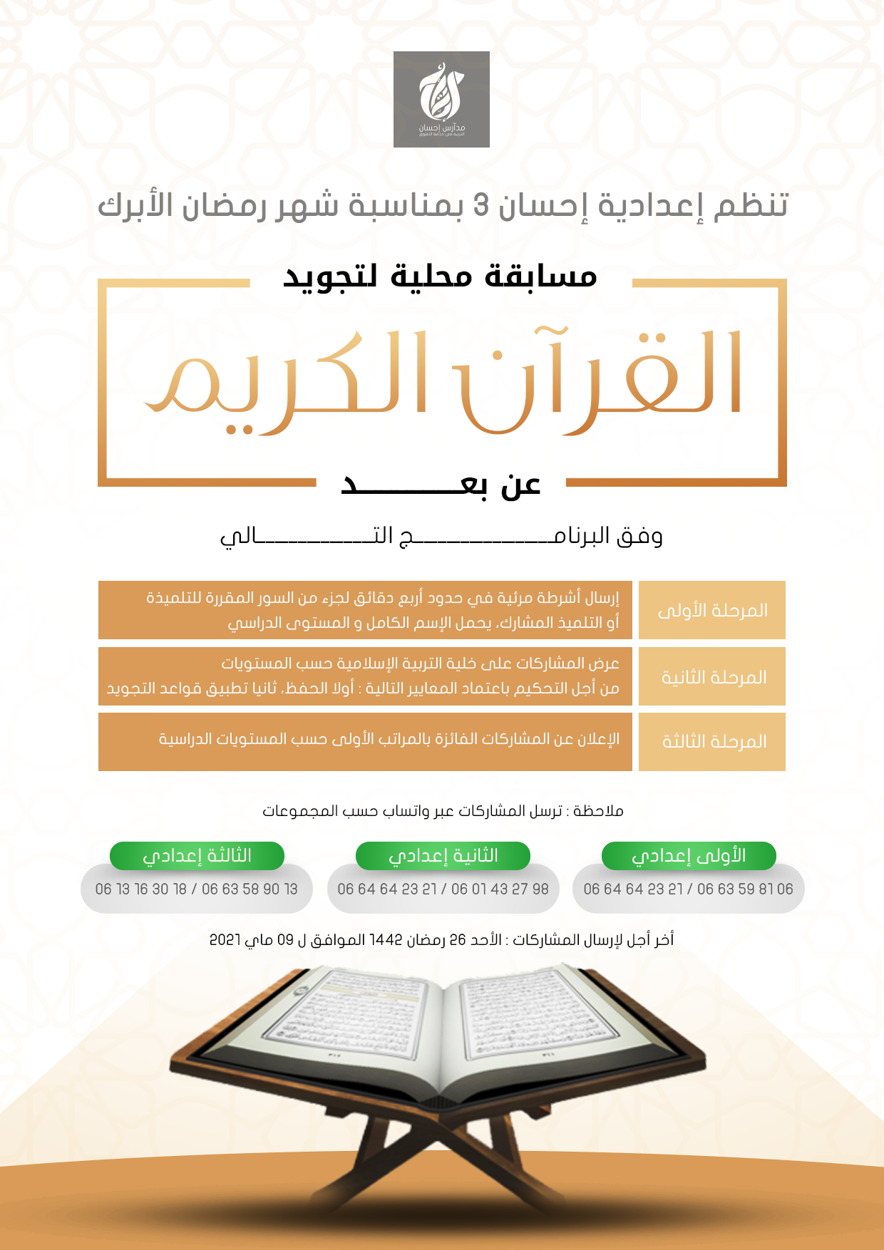في اطار الانشطة الموازية للمؤسسة بهدف فتح المجال للمتعلمات و المتعلمين لابراز مواهبهم المختلفة. تنظم اعدادية احسان 3 بمناسبة شهر رمضان الابرك, مسابقة محلية لتجويد القران الكريم