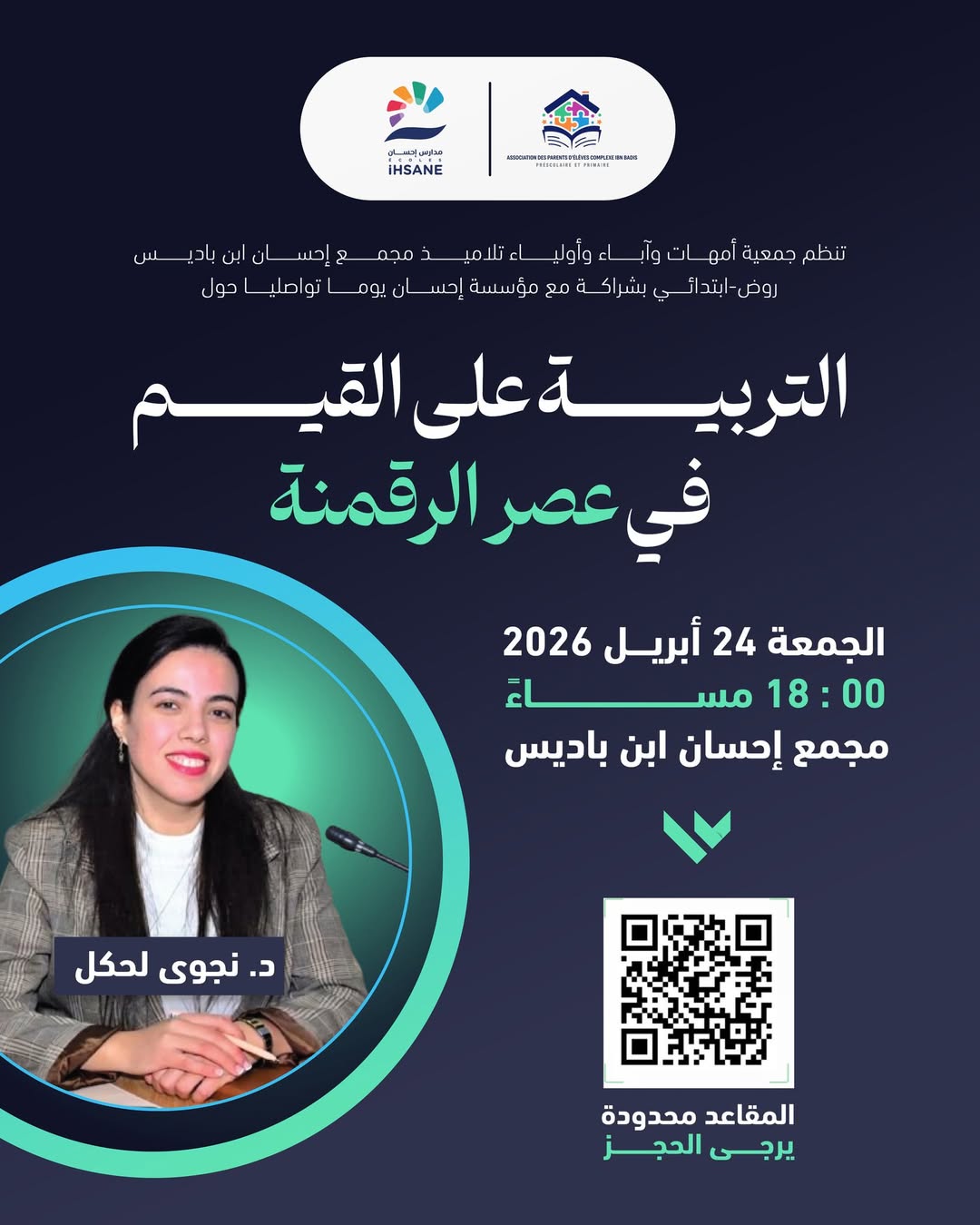 موعدنا يوم الجمعة 24 أبريل 2026، على الساعة 18:00 مساء بمجمع إحسان ابن باديس. المقاعد محدودة لذا يرجى منكم تأكيد حضوركم عبر مسح رمز QR CODE الموضح في الإعلان لضمان مقعدكم. 🏫🕒