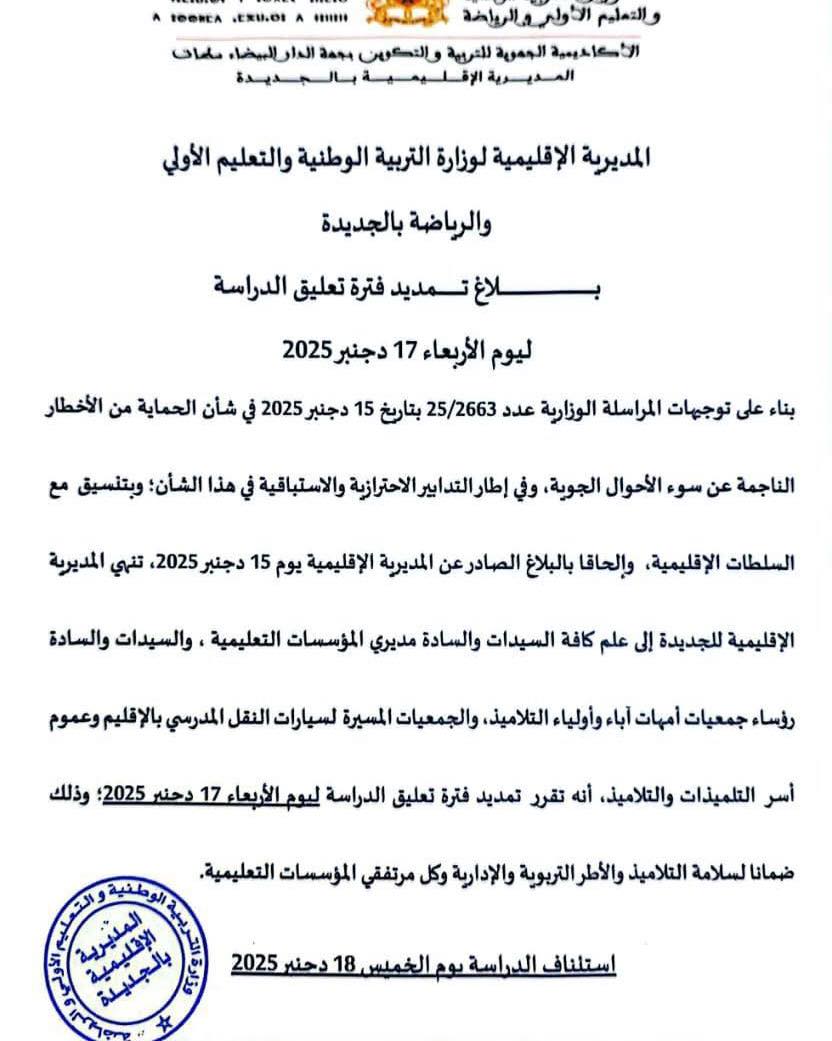 Déc162025Générale ❗❗ تمديد فترة تعليق الدراسة ليوم الأربعاء 17 دجنبر 2025 ❗❗ 16 décembre 2025 Share this post Partager sur FacebookPartager sur Facebook Partager sur WhatsAppPartager sur WhatsApp Navigation articlePrécédent Article précédent :هام جدا – تعليق الدراسة اليوم: 16 دجنبر 2025 بسبب سوء الأحوال الجويةSuivantArticle suivant :Creativity in Action at Campus Ihsane Ibn Badis Our CP and CE2 students at Ca…Related postsCreativity in Action at Campus Ihsane Ibn Badis Our CP and CE2 students at Ca…18 décembre 2025هام جدا – تعليق الدراسة اليوم: 16 دجنبر 2025 بسبب سوء الأحوال الجوية16 décembre 2025Apprendre en partageant : le petit déjeuner de la maternelle Ce vendredi, les é…8 décembre 2025Les inscriptions aux examens officiels de certification linguistique sont désorm…6 décembre 2025تنزيلاً لمشروع المؤسسة – السلك الإعدادي وبعد نجاح المعرض الجماعي لمدة عشر سنوات…5 décembre 2025تحت شعار: الرياضة أخلاق وتفوّق بكل فخر واعتزاز، تتقدّم مدارس إحسان بتهانيها الح…5 décembre 2025
