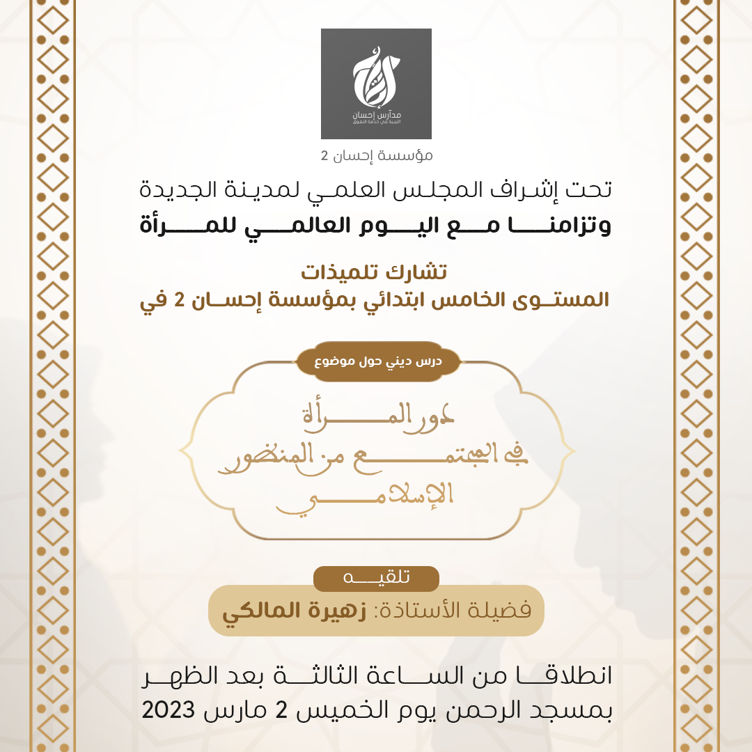 تحت إشراف المجلس العلمي لمدينة الجديدة و تزامنا مع اليوم العالمي للمرأة، تشارك تلميذات المستوى الخامس ابتدائي بمؤسسة إحسان 2 في درس ديني حول موضوع