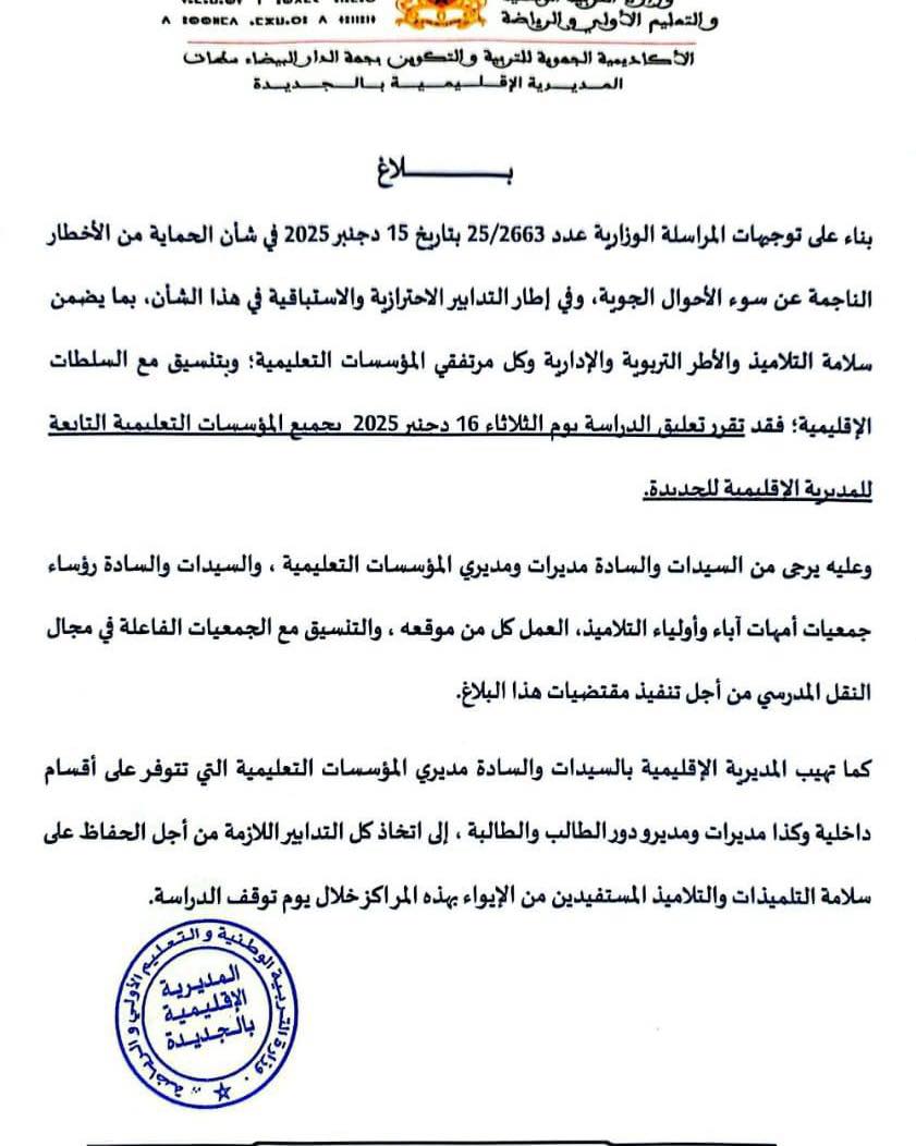 Déc162025Générale ❗❗هام جدا – تعليق الدراسة اليوم: 16 دجنبر 2025 بسبب سوء الأحوال الجوية 16 décembre 2025 Share this post Partager sur FacebookPartager sur Facebook Partager sur WhatsAppPartager sur WhatsApp Navigation articlePrécédent Article précédent :Apprendre en partageant : le petit déjeuner de la maternelle Ce vendredi, les é…SuivantArticle suivant :تمديد فترة تعليق الدراسة ليوم الأربعاء 17 دجنبر 2025Related postsCreativity in Action at Campus Ihsane Ibn Badis Our CP and CE2 students at Ca…18 décembre 2025تمديد فترة تعليق الدراسة ليوم الأربعاء 17 دجنبر 202516 décembre 2025Apprendre en partageant : le petit déjeuner de la maternelle Ce vendredi, les é…8 décembre 2025Les inscriptions aux examens officiels de certification linguistique sont désorm…6 décembre 2025تنزيلاً لمشروع المؤسسة – السلك الإعدادي وبعد نجاح المعرض الجماعي لمدة عشر سنوات…5 décembre 2025تحت شعار: الرياضة أخلاق وتفوّق بكل فخر واعتزاز، تتقدّم مدارس إحسان بتهانيها الح…5 décembre 2025
