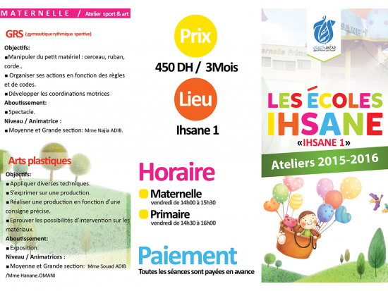 Pour créer des liens forts entre ses élèves, Ihsane 2 propose des ateliers parascolaires artistiques, dramatiques, sportifs … Inscriptions ouvertes et places limitées… Prenez du plaisir à l’école 🙂