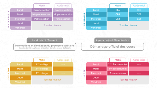 Chers parents,La rentrée scolaire aura lieu lundi 7 septembre, selon le programme défini dans les tableaux ci-joints. Pendant les 3 premiers jours, nos élèves vont bénéficier d’une simulation du protocole sanitaire (gestes barrières, circulation dans les locaux de l’école) et d’une formation sur l’ensemble des mesures prises pour la sécurité de chaque personne. Le démarrage…