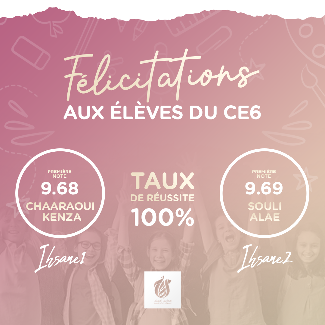 Nous tenons à adresser nos chaleureuses félicitations à nos lauréats de la 6 ème année primaire de l’école IHSANE 1 et l’école IHSANE 2 avec un taux de réussite de 100% . La persévérance et le travail, ça paie toujours!